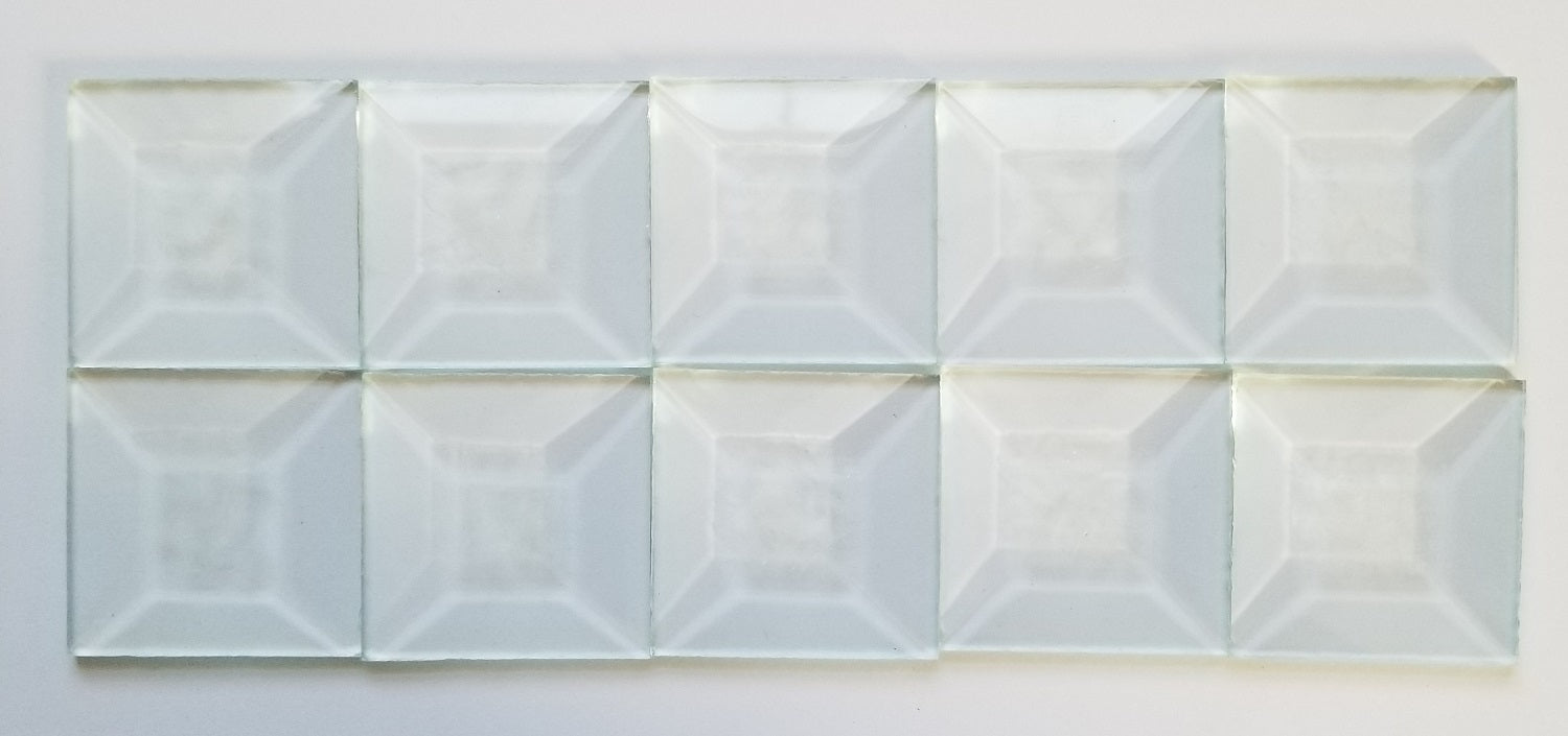 Beveled glass creates beautiful sparkles of light 2" x 2" glass bevels Enjoy the unique "Jack Frost" textured surface of this bevel Slanted edges refract light into a rainbow of colors