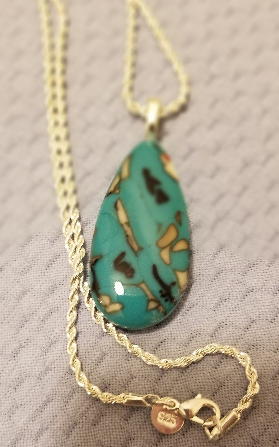 This teardrop measures approximately 2 inches long by 1 inch wide, not including the 18 inch Sterling Silver Necklace Plated with Rhodium so it will not tarnish. Will be packaged in an attractive black gift box. Multiple steps to create this pendant. I attempted to insert veining into the glass to give it a more organic look.