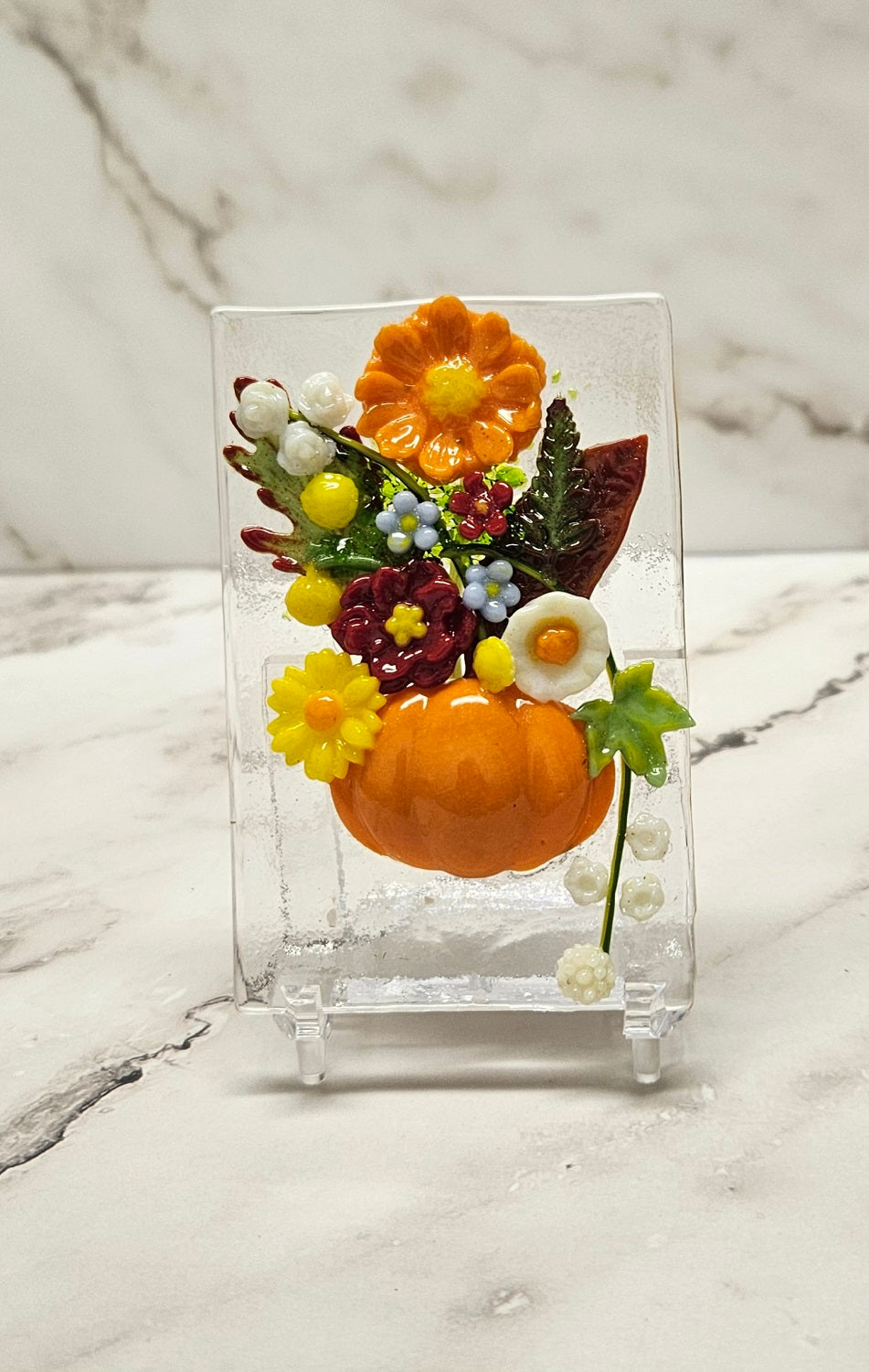 These bouquets include all handmade flowers, leaves, pots/vases, etc. and are arranged to have a full look. They are different sizes, which will be indicated in the title of each piece. They all include a stand which is clear acrylic and very sturdy. Dimensions will include the stand.