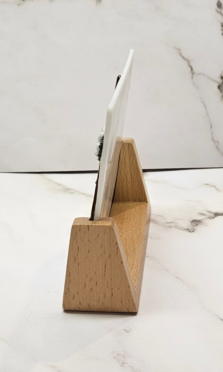 Panel measures approximately 5.00 inches tall x 5.5 inches wide including wooden beech stand.  The stand is 1.75 inch deep