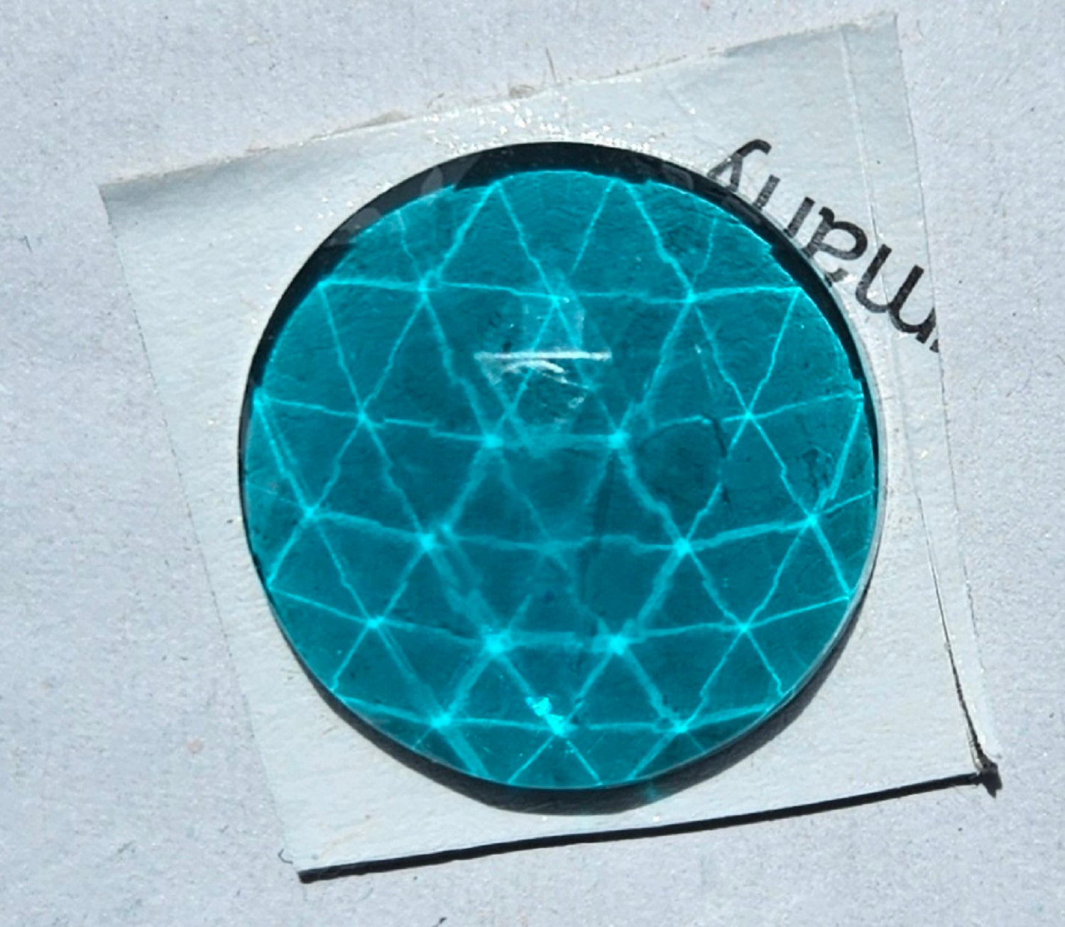 Blue Green 20mm (approximately .78 inch in diameter) flat back glass faceted jewel.  Completely clear, no backing on it.